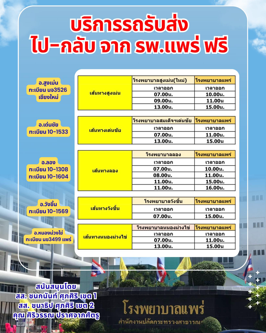ทั้งนี้ยังรบุอีกว่า "ต้นทางจาก รพ. ประจำอำเภอ ส่งที่ รพ. แพร่ ทุก 2-4 ชั่วโมง เริ่มตั้งแต่วันที่ 27, 30,31 มีนาคม และ 1,2,3,4 เมษายน เพื่อช่วยลดภาระค่าใช้จ่าย และอำนวยความสะดวกให้พี่น้องประชาชนในช่วงเวลานี้ (นำร่องวันละ 1-2 คัน รอบละ 10 -15 คน และกำลังหารถบริการเพิ่ม) แม้อาจไม่ใช่ทางออกทั้งหมด แต่คือการเริ่มต้นช่วยเหลือที่ทำได้ทันที"