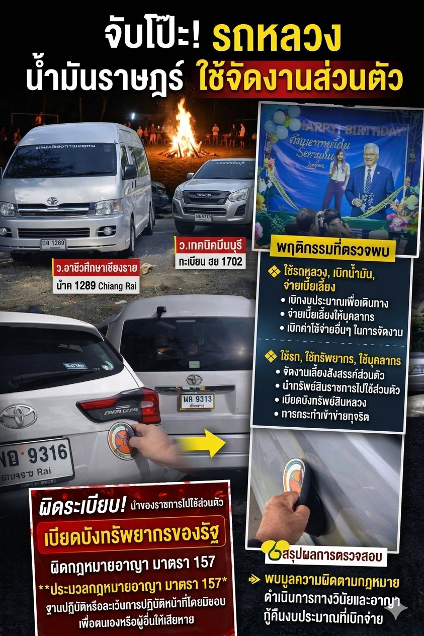 เพจดังแฉยับ! จี้ ป.ป.ช. ตรวจสอบ หลังรถหลวง-น้ำมันรัฐ ถูกใช้ร่วมงานวันเกิดปลัด ศธ.